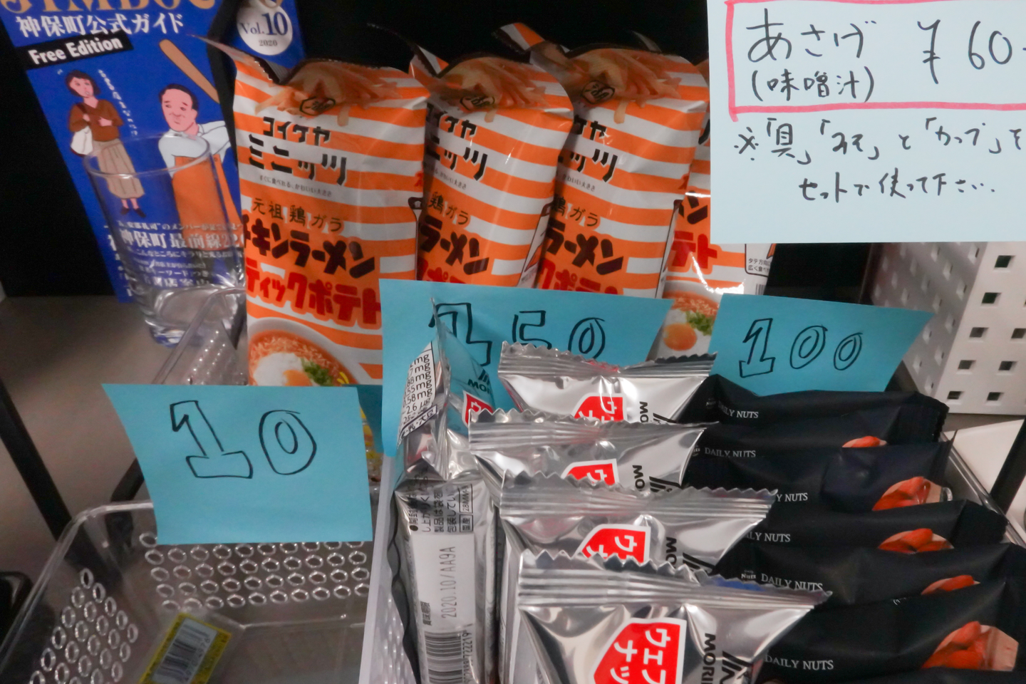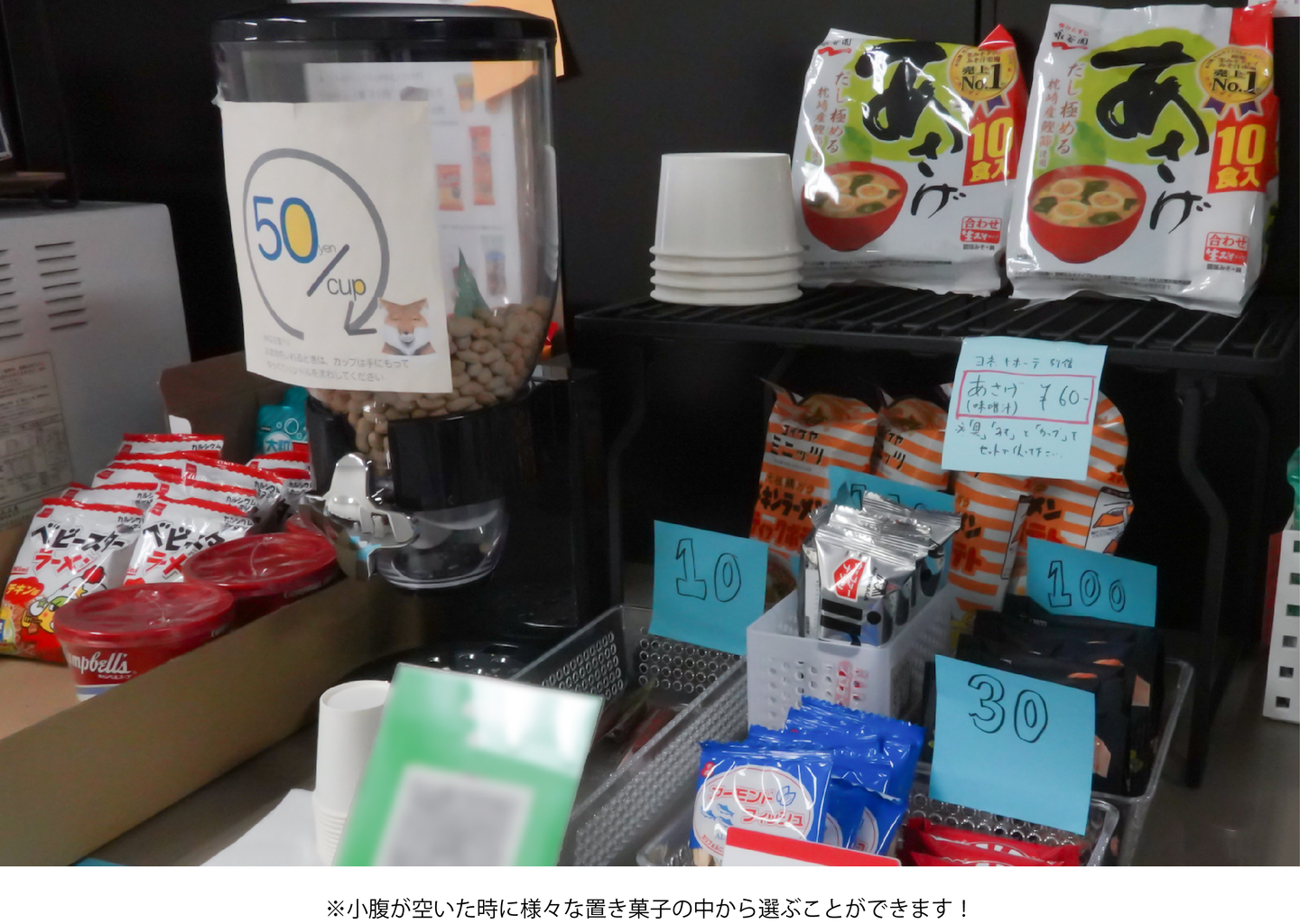 ・小腹が空いた時にお煎餅類が良さそうと感じたが、しけってしまうリスクがあるので断念しました。その後アルミ蒸着フィルムのパッケージを使用している商品を置くようにしました