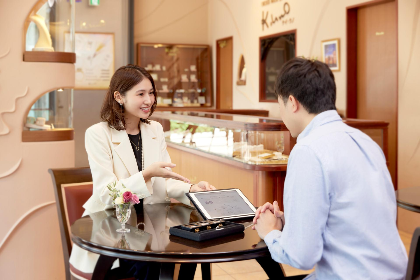 ジュエリーの基礎知識や接客成功例などの社内知識はすぐ共有されるような仕組みになっており、手元のiPadでいつでも気軽に閲覧することもできるんですよ。」