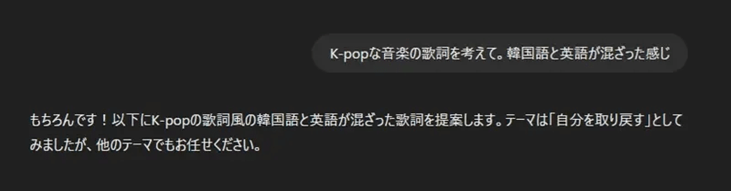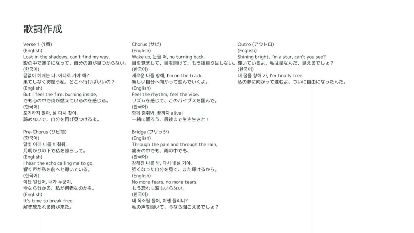 AIツール「SUNO」を使用し、ChatGPTより生成した歌詞を元にK-POP風の楽曲を作成。複数のバリエーションを比較し、最適な楽曲を選択し、音質の向上やステム分離には「Ultimate Vocal Remover」を活用しました。
