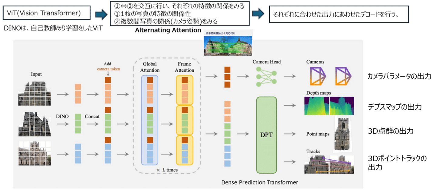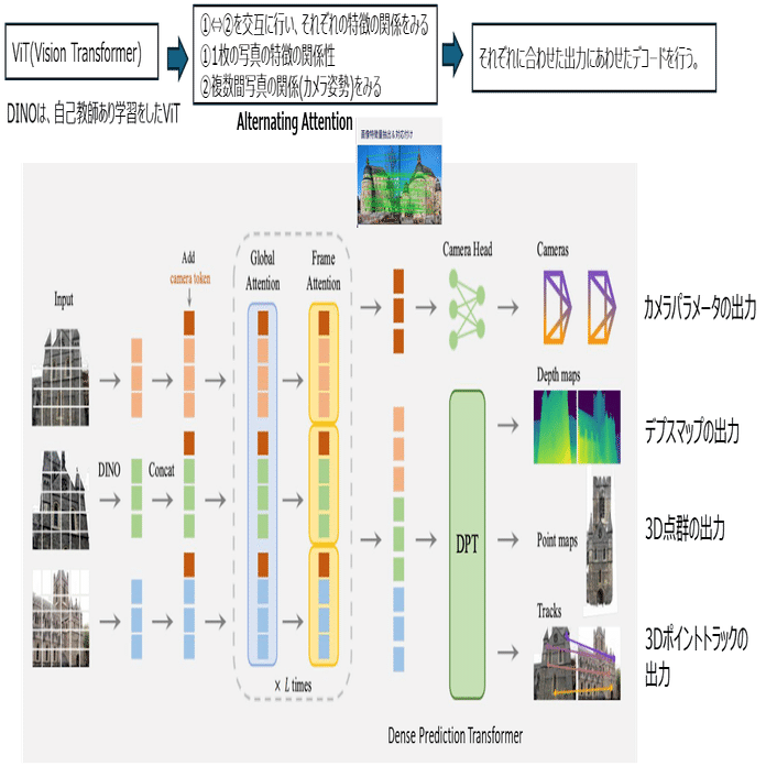 VGGTの心臓部は、Vision Transformer(ViT)をベースにした独自のアーキテクチャです。特に重要なのが「Alternating Attention(交互注意機構)」という仕組みです。