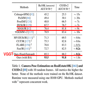 AUCは、機械学習における精度の指標で数値が大きければ大きいほど良い指標。従来手法であるDUSt3RとMASt3Rと比較してVGGTは速さも早くなり、精度も高くなっていることが分かります。