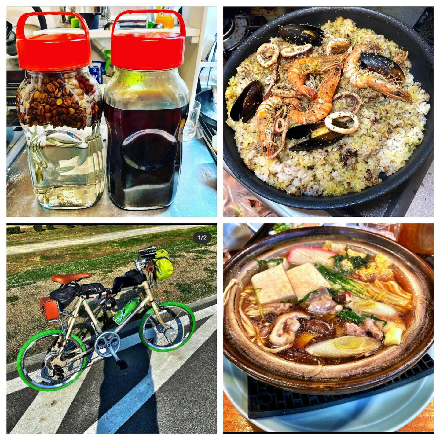 ※写真は、何事にも興味をもって取り組んでいる大内さんの趣味になります。(左上:自家製珈琲焼酎、右上・右下:自炊、左下:サイクリング)