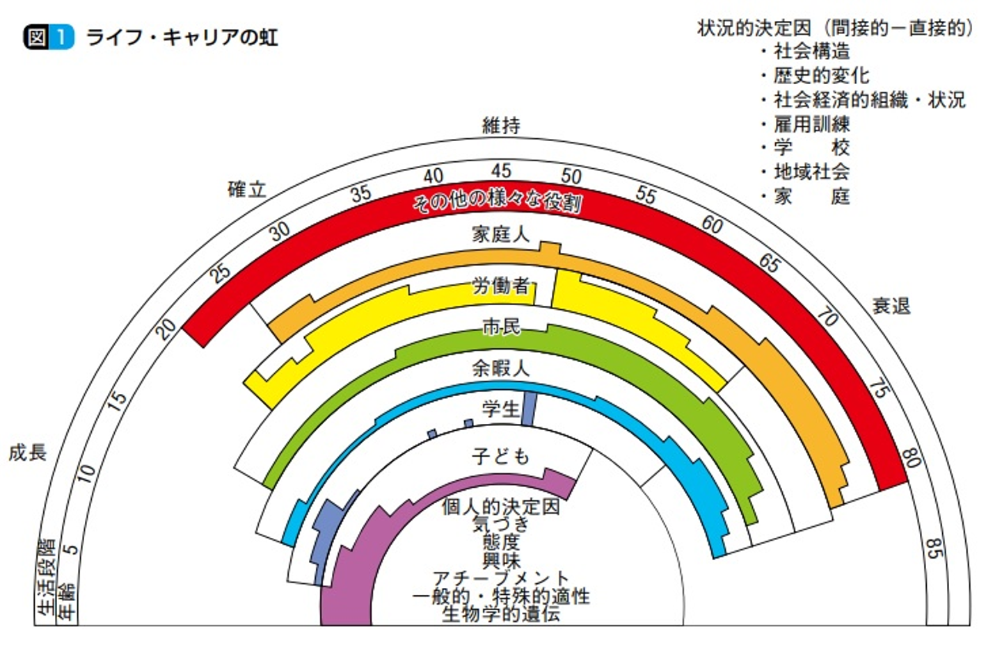 例えば、職業指導の発展に大きな影響を与えた、アメリカの教育学者のドナルド・E・スーパーの、”ライフ・キャリア・レインボー”という概念。