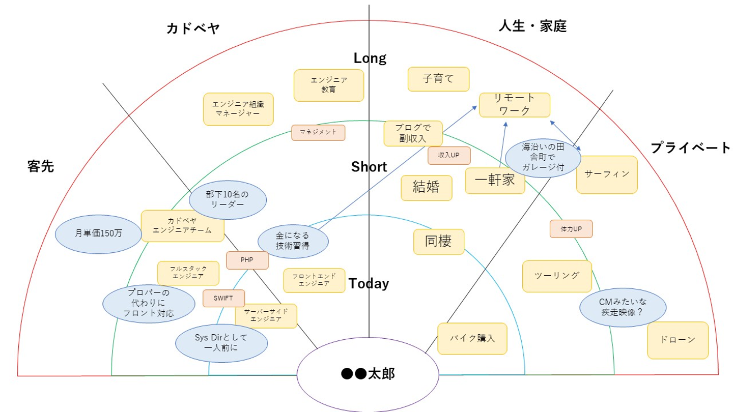 仕事だけではなく、プライベートやライフプラン等いろいろな場面を想像して、短期・中期・長期的にどうなっていきたいかを書き込み、それを第三者にも見てもらったり、定期的に自分の立ち位置を見直しながら、意欲的に目標に向かって取り組んでいくものでした。