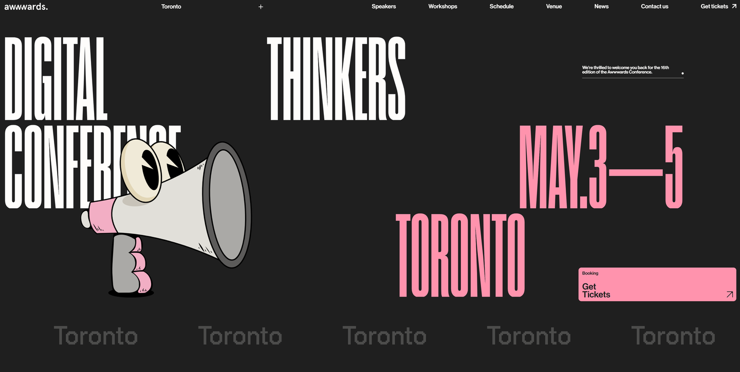 Awwwardsの次回カンファレンスがトロントで開催されますが、そのカンファレンスサイトにも縦長の英字が使われているので、このフォントやデザインは流行っているんでしょうね。