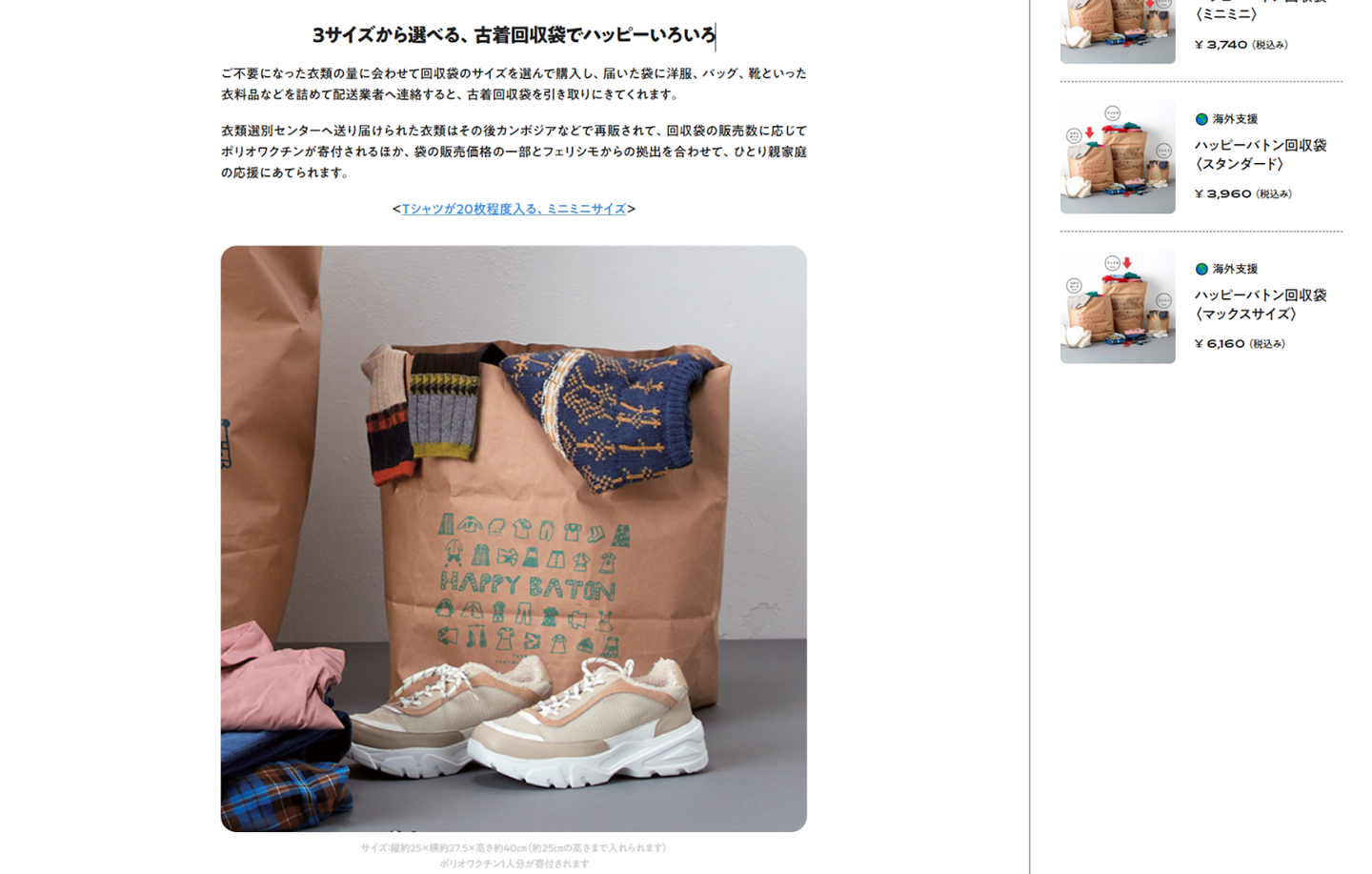 例えば、古着回収袋を購入して、使い終わった服を古着回収袋に詰めて送ると、衣類は安く再販されて、かつ販売数に応じて開発途上国の子どもたちにポリオワクチンを贈れる、という仕組みになっているようです。