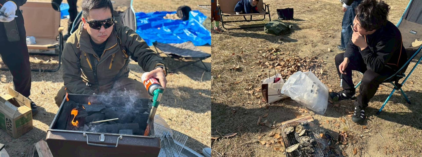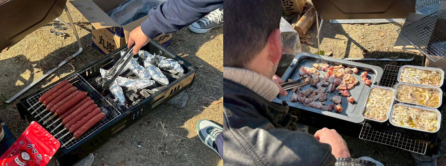 集合後は、みんなで炭の火おこしや食材等々を焼いていきました。