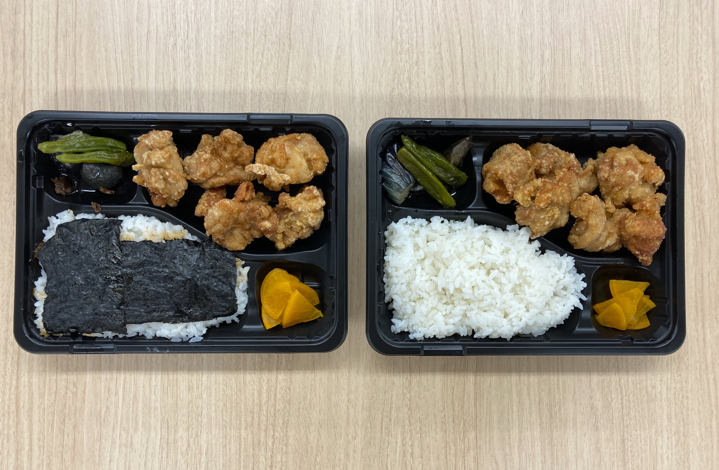 おすすめのお弁当2種を食べ比べてみたところ、個人的にはから揚げ海苔弁当が好きですね。海苔とおかかでお米を食べつつ、しっかりから揚げを味わえるので。