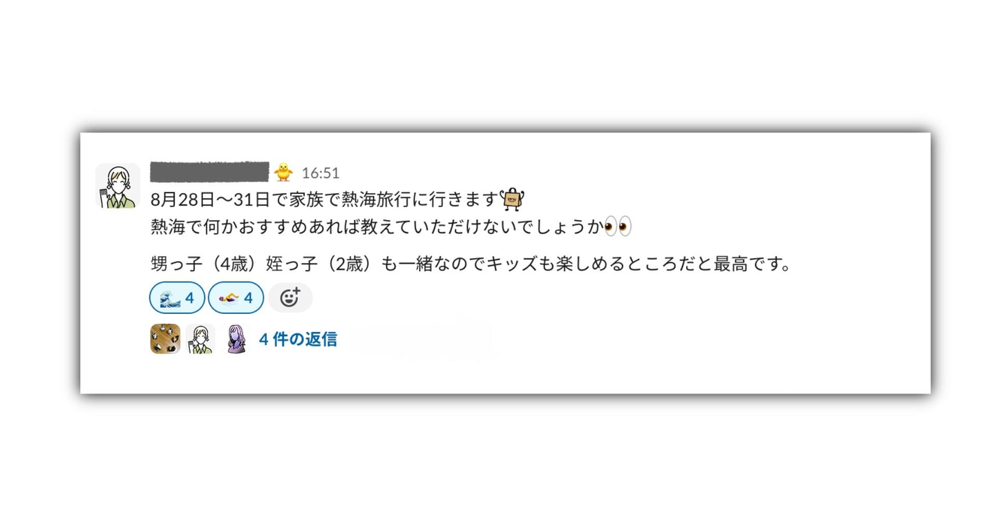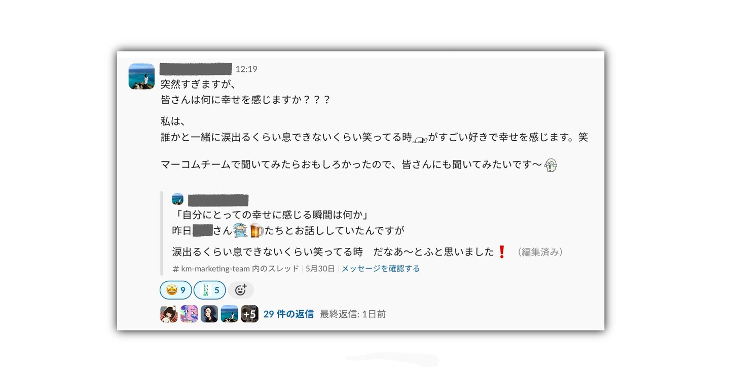 こちらは、マーケティングチームKさんからの「幸せを感じる瞬間は?」という質問。次々と返信があり、みな思い思いの幸せをシェアしていました。この質問をするKさんも、この話題で盛り上がるメンバーも素敵だなあと思いました。