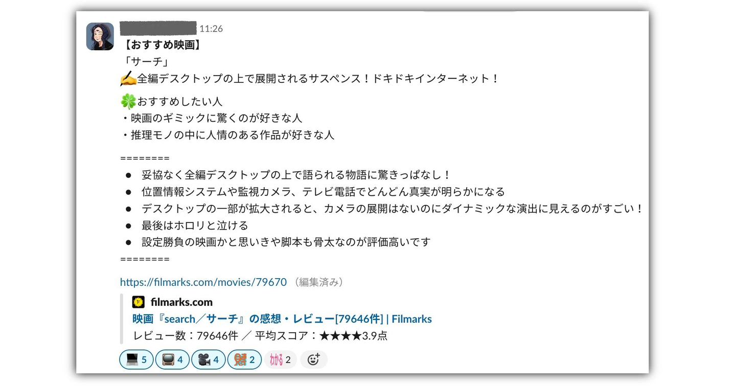 エンタメを共有するチャンネルもお気に入りです。本、映画、ゲーム、音楽。メンバーがそれぞれのおすすめを自由にシェアしています。隙間時間にちょこっとのぞいて「次の休みには、〇〇さんが紹介していた映画を見ようかな」など考えるのが楽しいです。自分のおすすめした作品に感想をいただけるのも嬉しい!