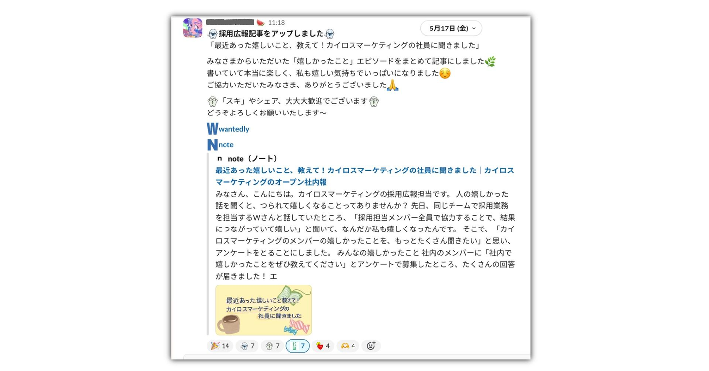 まずは、記事公開チャンネル。ここはオウンドメディア「マケフリ」の公開、会社のプレスリリースやニュース公開、採用広報記事など、社外に向け情報を公開したことを共有するチャンネルです。