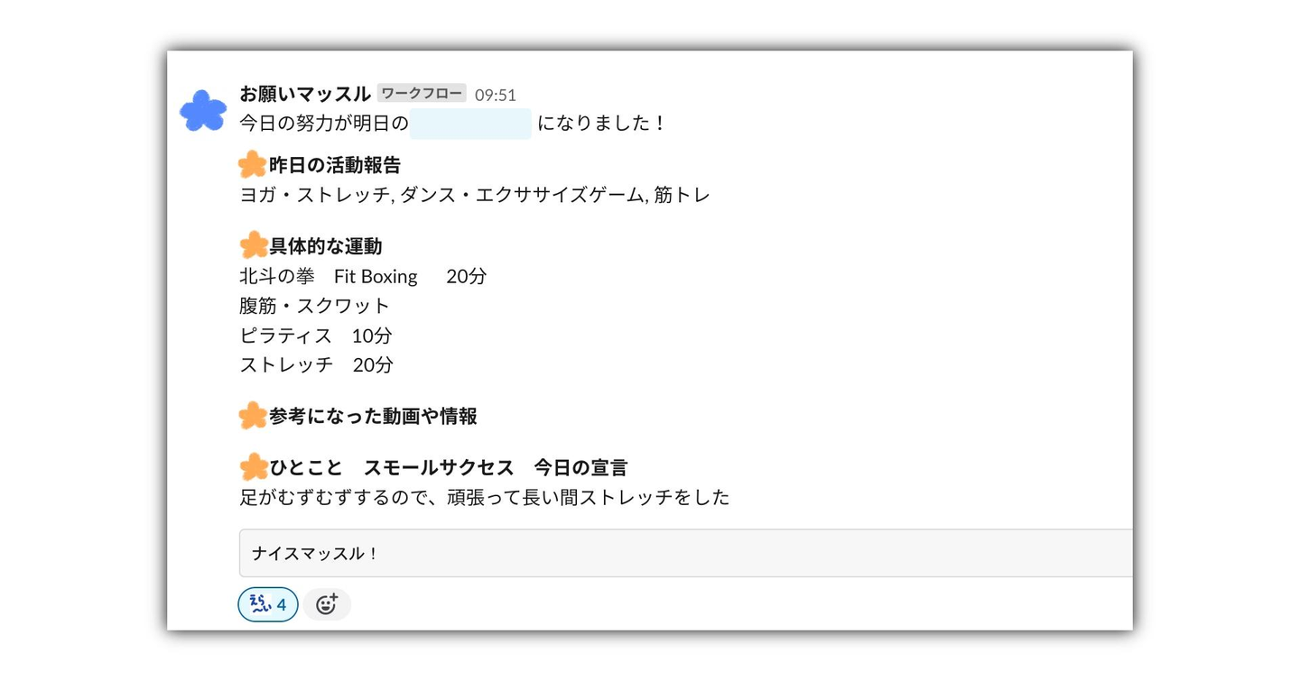 スタンプを押したりコメントしたりして、みんなで励まし合っています。自分一人ではどうしても続かない運動も、メンバーに褒めてもらえると思えば頑張れるはず...!(すみません。最近サボっています)