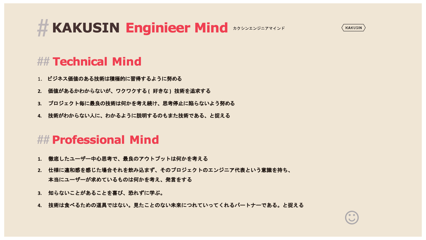 カクシンのエンジニアマインドは、技術観点でのTechnical Mindとそのプロジェクトにおいてエンジニア代表という意識を持つといった視点のProfessional Mindの2つに分けて考えています。