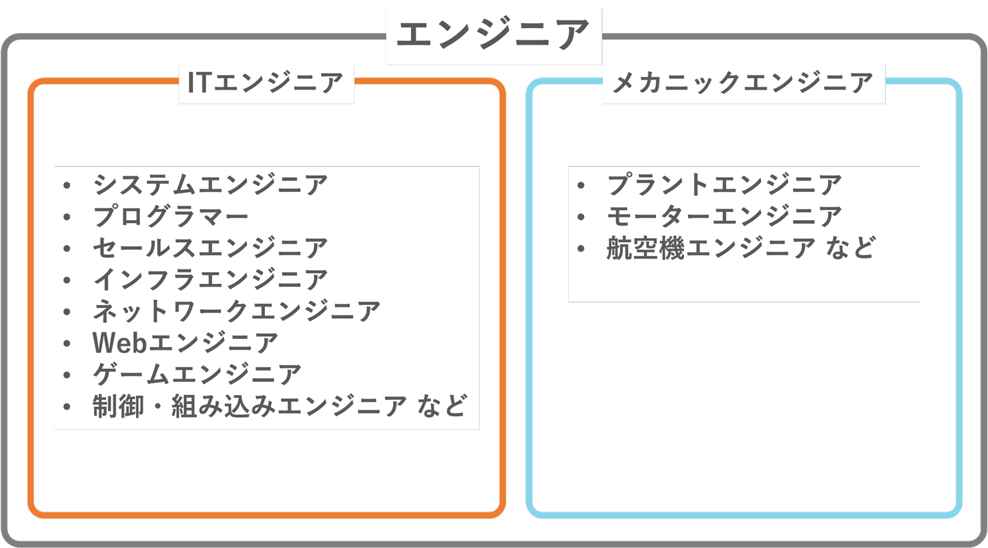 ITエンジニアからさらに、システムエンジニアやインフラエンジニア、Webエンジニア、ゲームエンジニアなど細かく分かれています。
