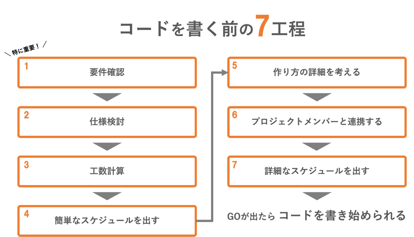 ここまでの7つの工程をクリアして、やっとエンジニアはコードを書き始めることができます。さらにその後はテストと修正を重ね、やっとローンチすることができるのです。