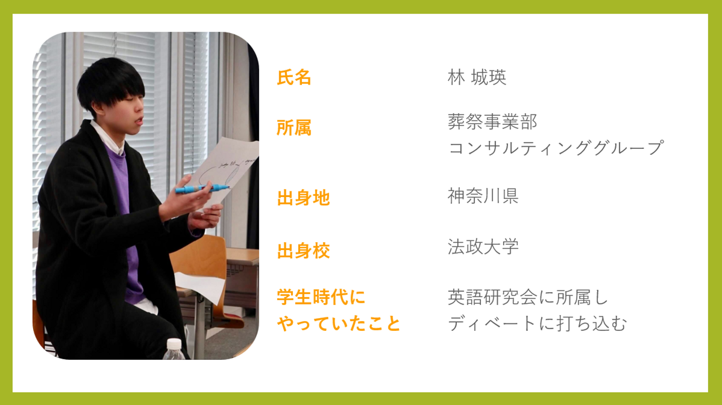 応募のきっかけは祖父が亡くなったことです。死生観を見つめ直し、就職活動の土壇場でエンディング業界に方向転換しました。「ポジティブな最期を迎えるため、前向きに生きる人を増やしたい」と決心したんです。