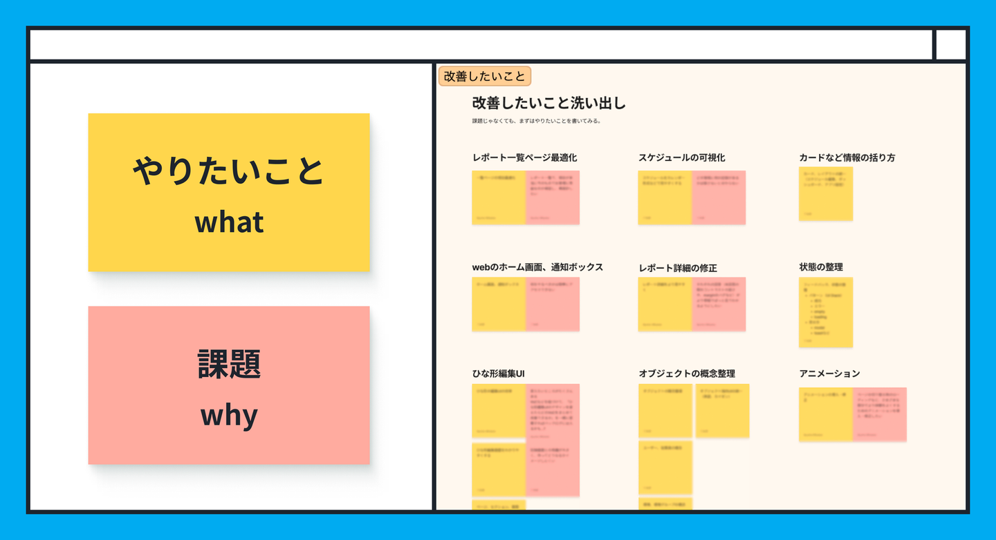やりたいこと(What)が最初に浮かびやすいので、それを洗い出してからその背景にある課題(Why)を仮説として言語化しました。