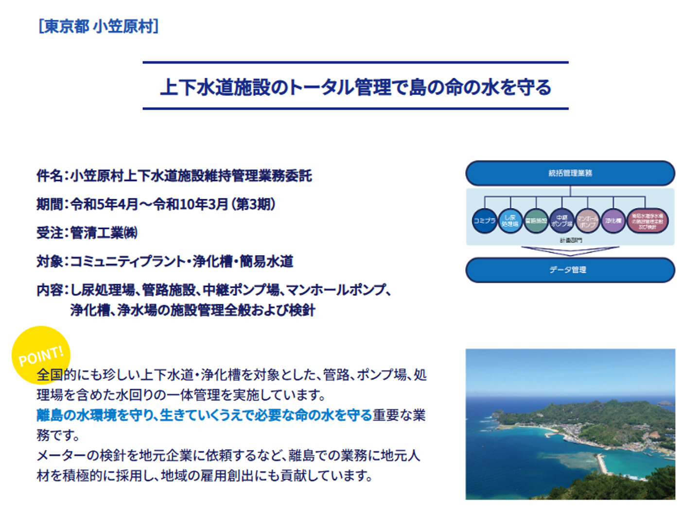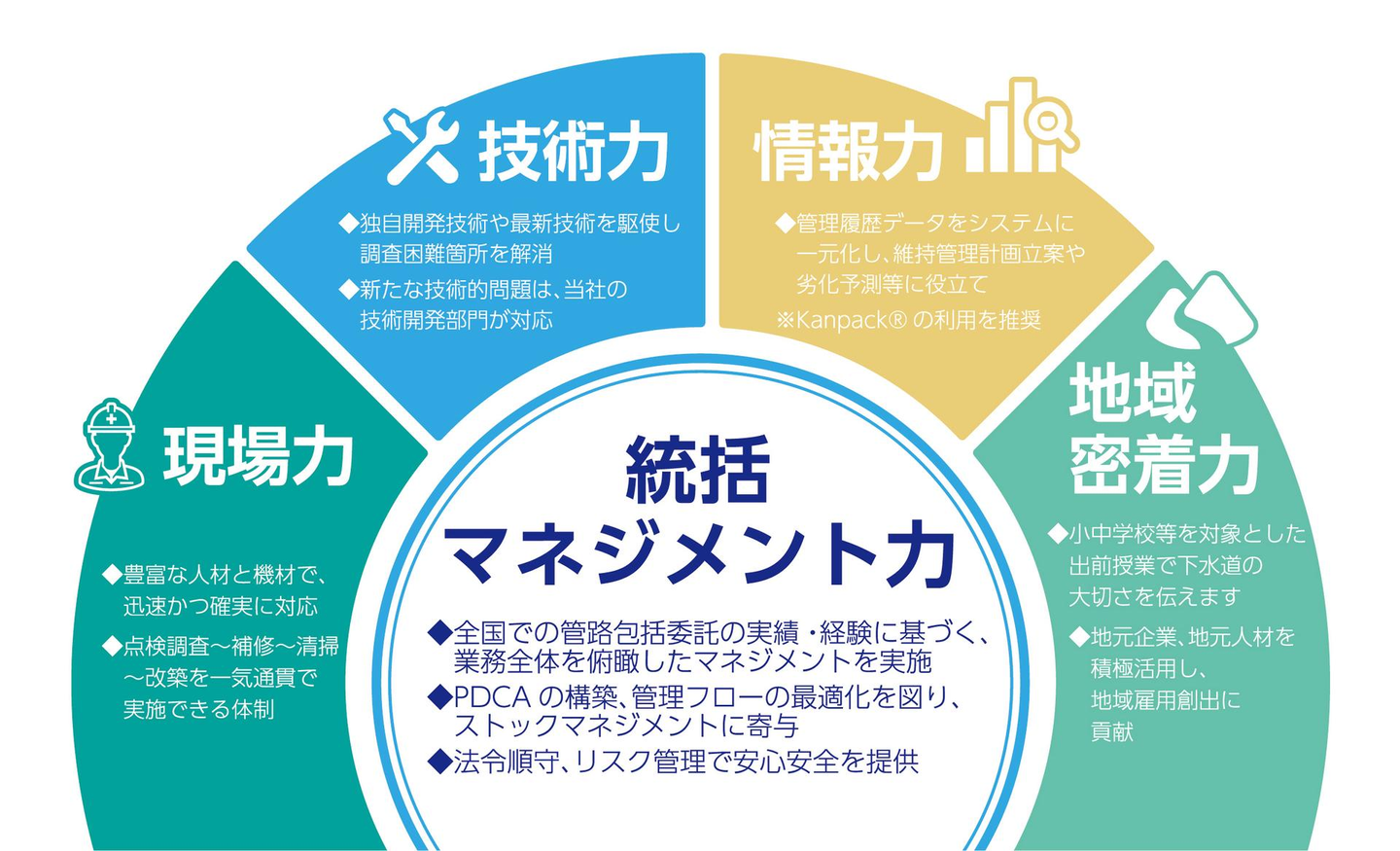 管清工業には全国で70契約もの管路施設包括的民間委託を受注しているという実績と経験があり、それに基づくノウハウがあります。業界のリーディングカンパニーとして、統括マネジメント力、技術力、現場力、情報力、地域密着力の5つの力でウォーターPPPを推進し、これからも安心・安全な暮らしを支えてまいります!