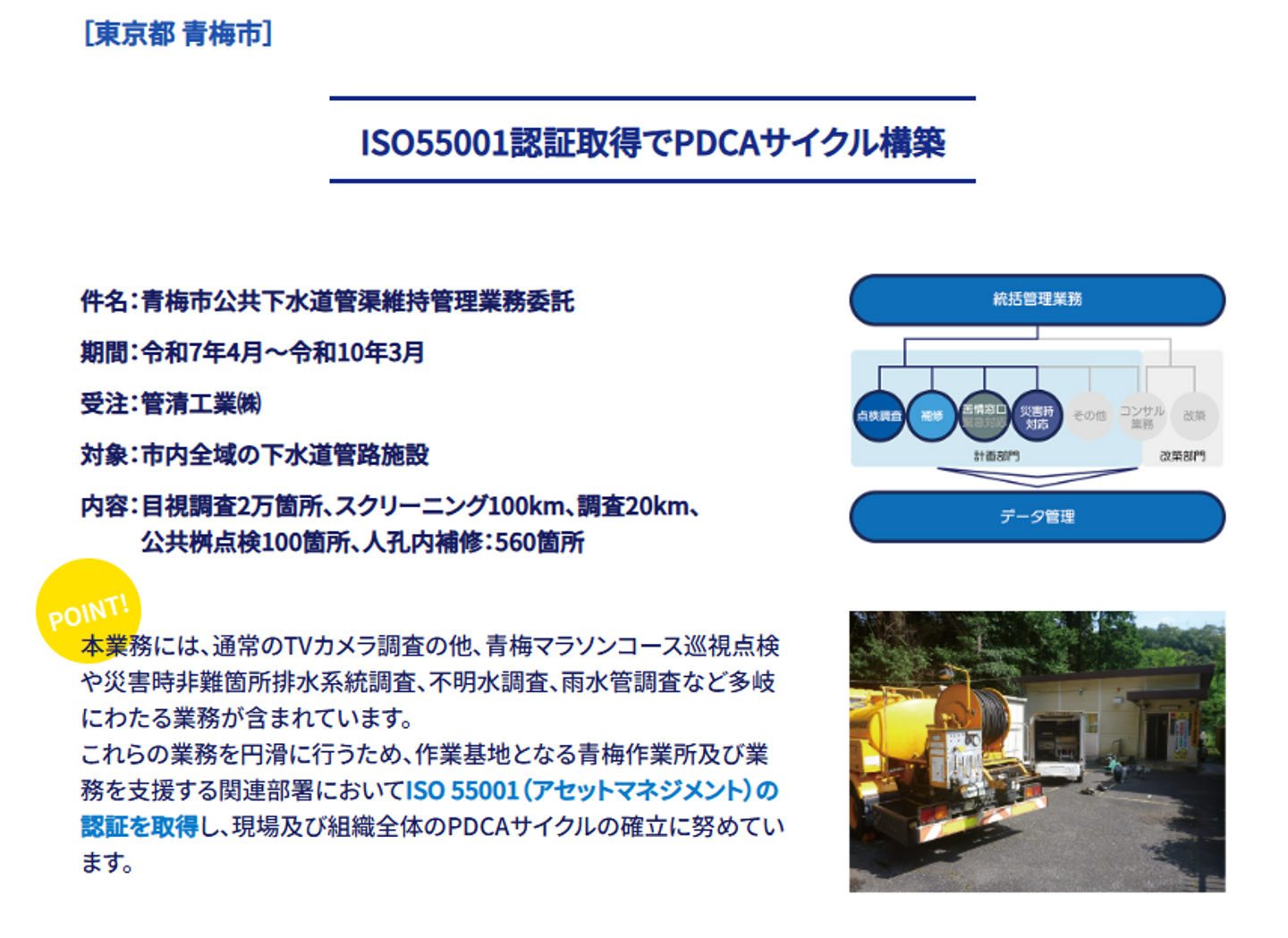 「管路施設包括的民間委託」は、自治体が下水道管路の点検、清掃、修繕などの業務を一括して管清工業のような民間事業者に委託する方式です。従来の単発発注に比べて、業務の包括化、3~5年程度の継続的な管理が可能になったことで、業務の効率化やコスト削減が期待され、2000年代以降、全国の自治体で導入が進みました。