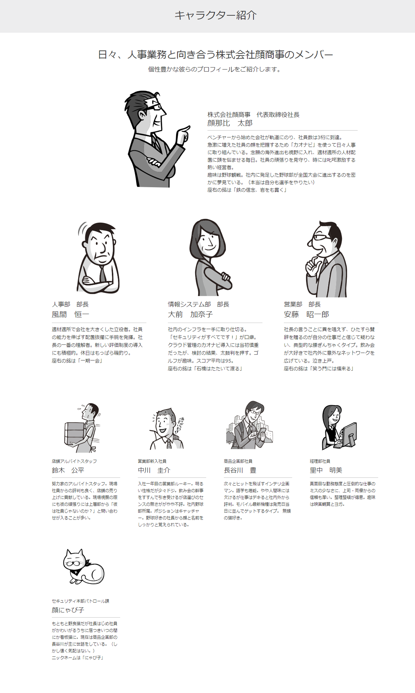 ちなみに、カオナビのサービスやWebサイトには、イラストのキャラクターを多く起用しています。
