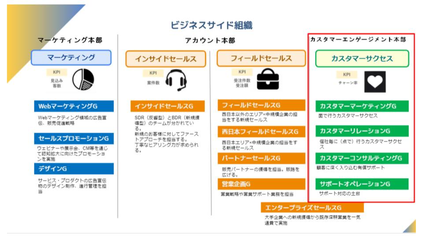 ビジネスサイドはマーケティング・インサイドセールス・フィールドセールス・カスタマーサクセスと大きく4つの組織に分けられています。