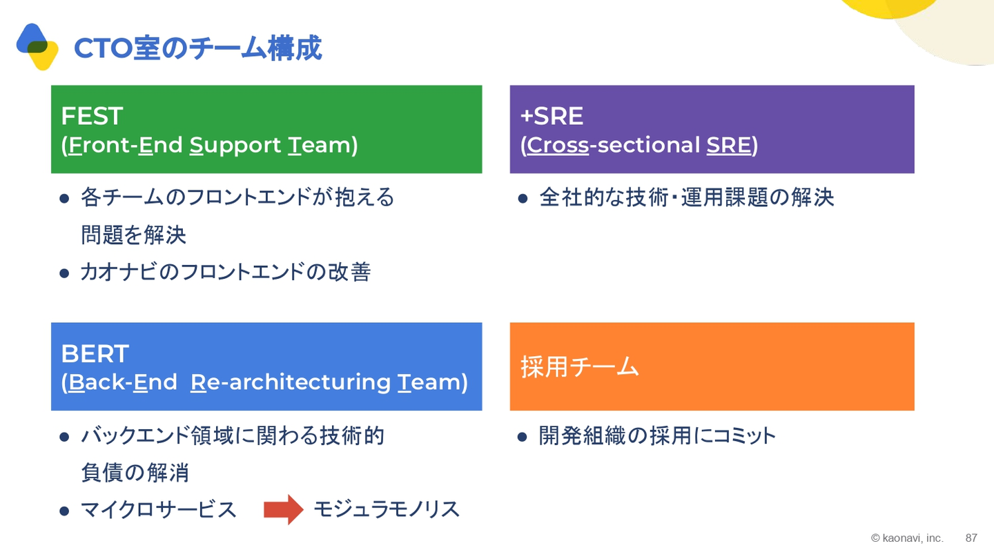 千葉:現在、CTO室には10名のメンバーが所属しているのですが、4つのチームに分かれています。フロントエンドの問題を解決する「FEST(フェスト)」、バックエンドに関わる技術負債を解消するための「BERT(バート)」、全社的な技術課題の解決をする「+(クロス)SRE」、そして「採用チーム」です。