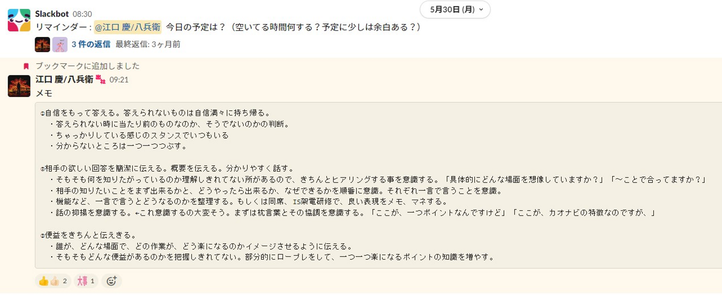 色々な工夫をしています。製品への理解を深めるために、Slackの分報に毎日システムの機能について気づいたことを発信するよう促すリマインダーを設定しました。投稿の材料として通勤中の電車でサポートサイトを読み込んでいます。こうすれば日々知識が増えますよね。先輩たちから「その機能、ほかにもこんな使い方もあるんだよ」といったコメントをもらえることもあってありがたいです。