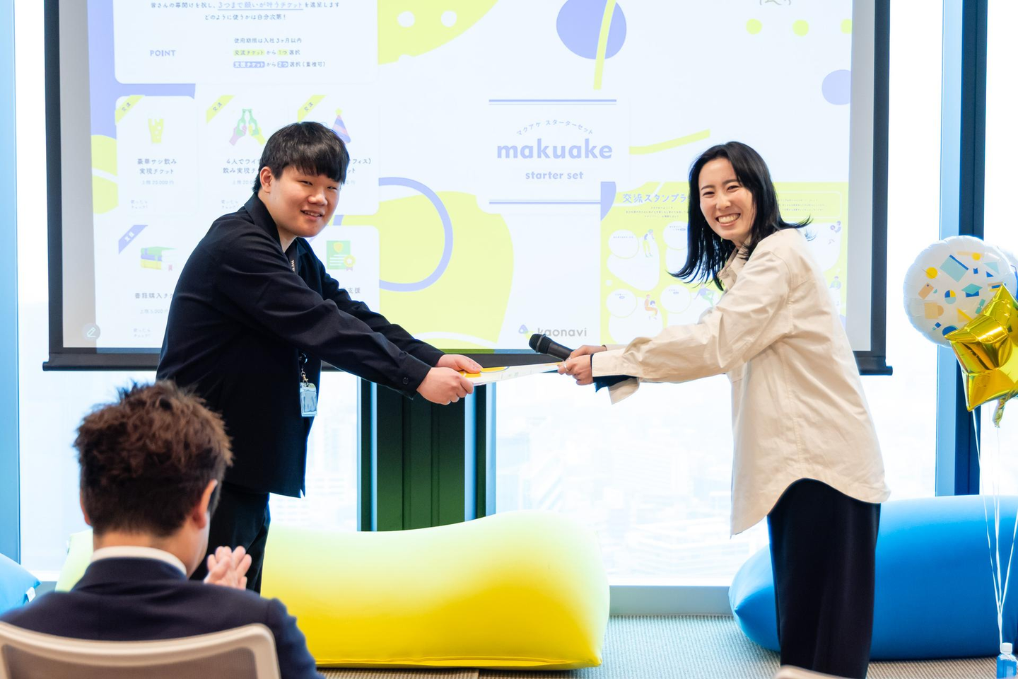 最後に、入社を記念して、先輩社員からの激励を集めることができる「交流スタンプラリー」と、パーティ会場(オフィス)手配やテレワークガジェット購入など、願いが3つまで叶うカタログギフトセット「マクアケスターターセット」が贈られます。