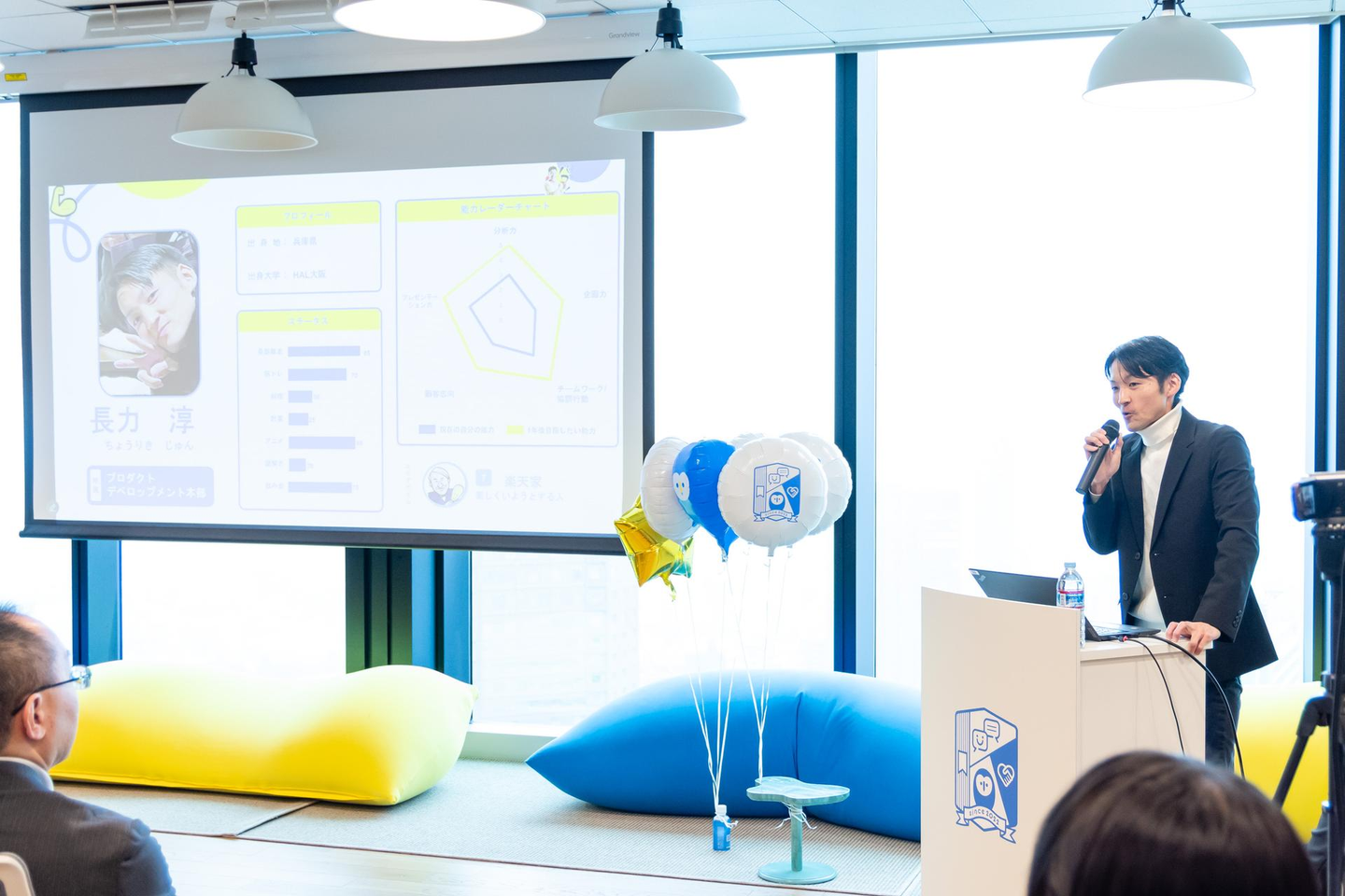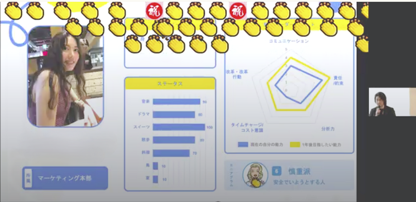続いて、2分の持ち時間で、新入社員一人ひとりが自己紹介を行いました。能力レーダーチャートや趣味・特技の棒グラフを用いて、それぞれの「個性」を紹介しつつ、現在と1年後目指したい能力などのプレゼンを実施。