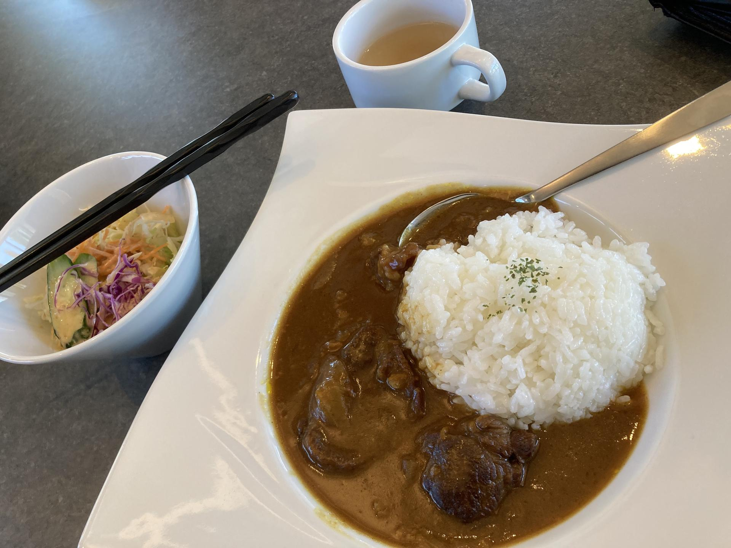 お昼時には、参加者有志でランチ会も行われました。今回のコーワーキングのお隣がカフェで、そこで5名ほどでテーブルを囲んでのランチタイムでした。IT企業のエンジニア、行政の企画担当者、学生など立場の異なる者同士が混ざり合い、仕事のきっかけや普段携わっているプロジェクトの話から週末の過ごし方、おすすめのランチ情報まで話題は多彩で、会話が弾みました。普段は接点のない立場同士でも、美味しいご飯を共にすることで一気に打ち解けることができました。