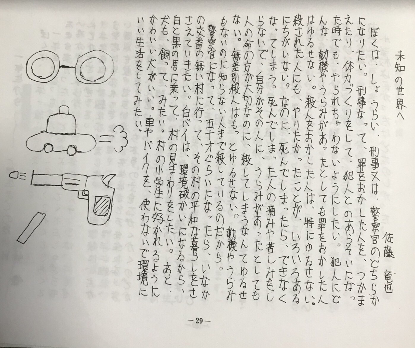 ▲佐藤の小学校時代の文集。正義感の強さは当時から変わらず。今でも「人の役に立ちたい」という思いは一緒