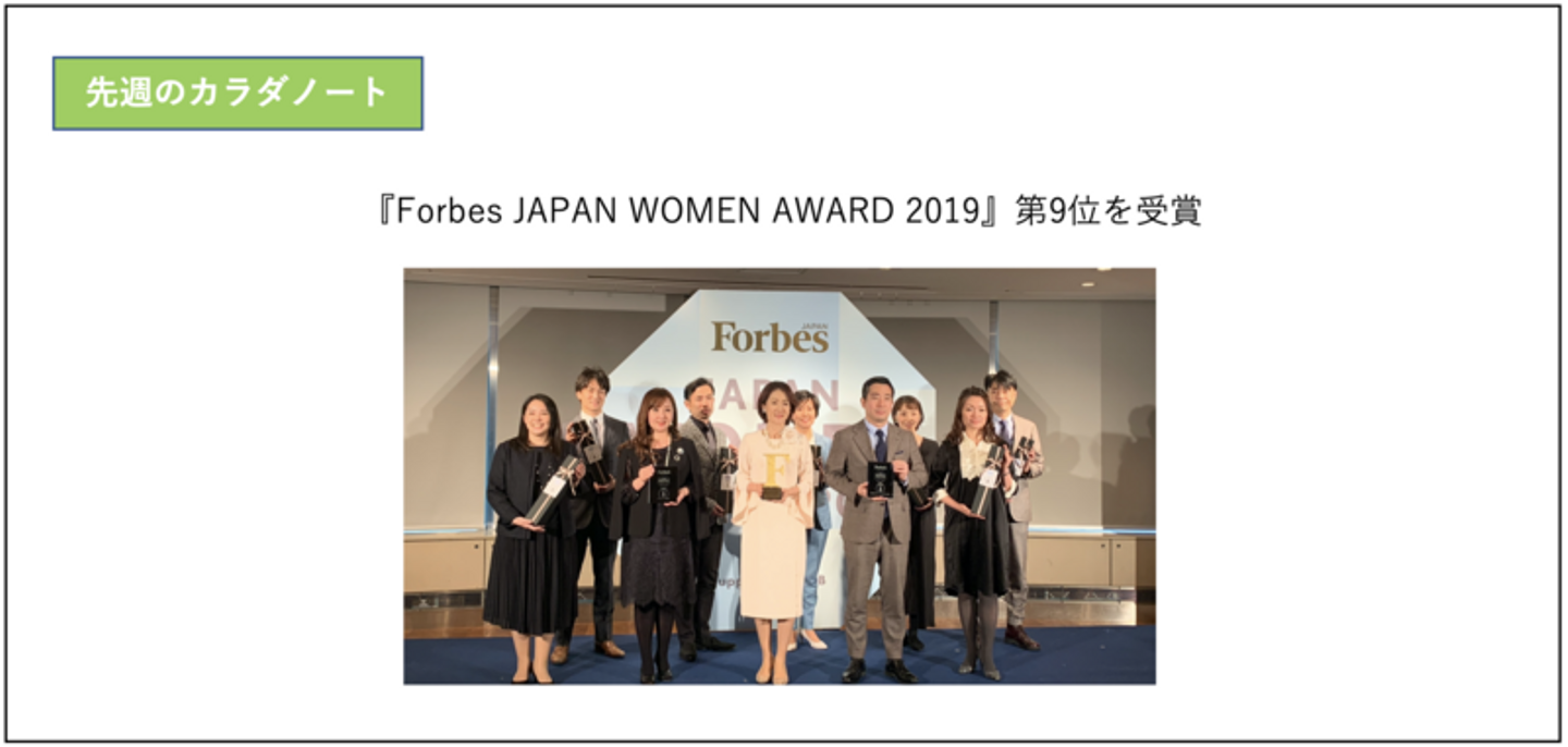 Forbes JAPAN主催、株式会社LiB協力の日本最大規模の女性アワード『Forbes JAPAN WOMEN AWARD 2019』の企業部門300名未満の部にて、当社が第9位を受賞いたしました。ライフステージが変わっても女性も男性も、働きやすく働きがいのある環境作りに力を入れてきた当社としては大変喜ばしい受賞となりました。