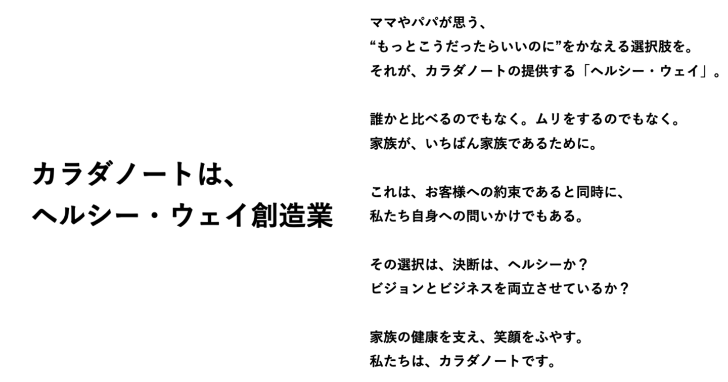 カラダノートは「家族の健康を支え笑顔をふやす」をミッションに、ファミリーデータプラットフォーム事業を運営する「ヘルシーウェイ創造業」です。