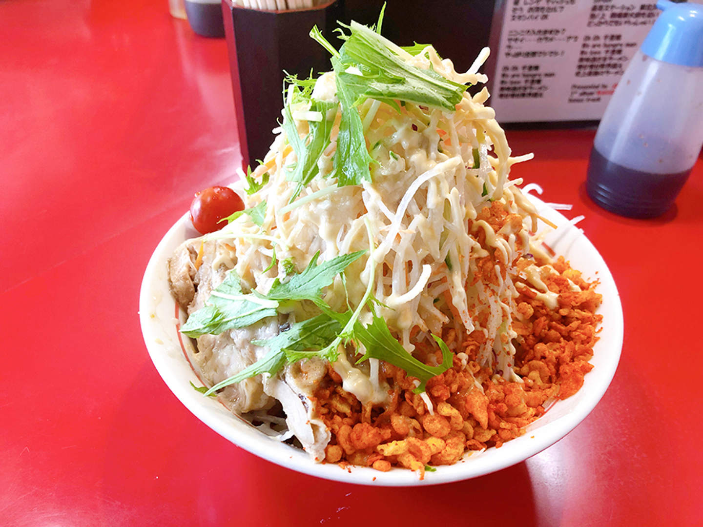 辛い揚げ玉が特徴的でおいしい、二郎系ラーメンのお店です(人を選びます)。おすすめは写真の「冷やし中華(夏季限定)」です。ミニトマトがワンポイントでプリティですよね。全体のフォルム・色合い・味、全て素晴らしく、これは芸術です。いつでも見れるように携帯の待ち受けにしています。