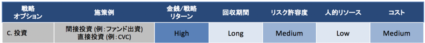 それぞれの戦略オプションは求めるリターン、回収期間、リスク、必要となる人的リソースの量などが異なるため、自社にとって最適な方法はどれか、新規事業開発に先立って検討しておくべきでしょう。