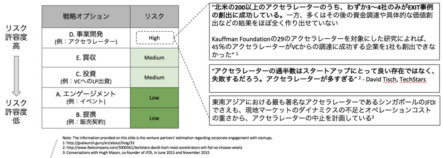500 startup のレポート では、事業開発を最もリスクの高い戦略オプションと説明しています。