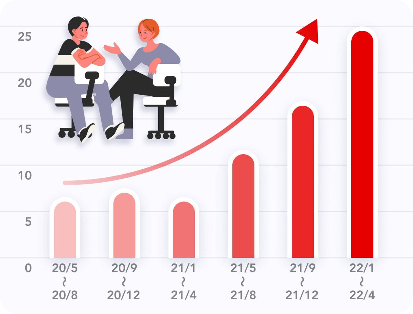 最初は複業でスタートしても、カウシェでの仕事にやりがいを感じ、正社員として入社したメンバーが8名います。中には、複業としての勤務を500日以上続けた後、正社員に転換したメンバーも。転換までの平均日数は373日です。