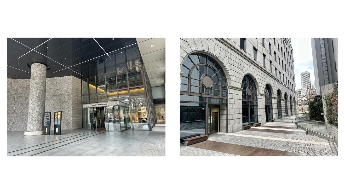 ビルのエントランス内には広い待合スペースや屋外ベンチもあり、