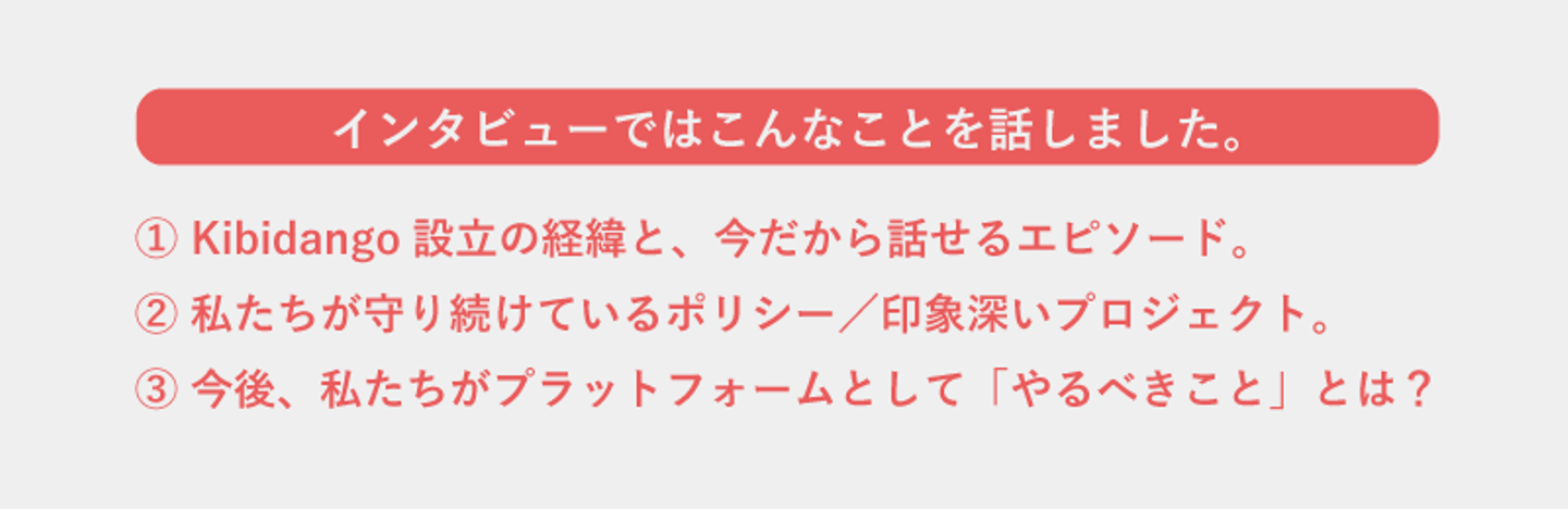 創業から事業内容やメンバーは変化していますが、代表をはじめとする創業メンバーによって、Kibidangoの根幹にある「スモールビジネスをエンパワーする」というポリシーはずっと守られてきたように思います。