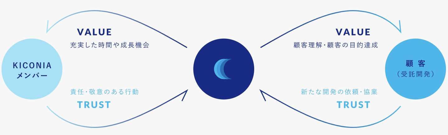 更に、勿論顧客とのプロジェクトが成功すれば、その対価をいただくことができます。それによってKICONIA WORKSにはお金や時間的な余裕も生まれる様になり、メンバーに対して価値(給与は勿論ですが充実した時間や成長機会)が与えられます。