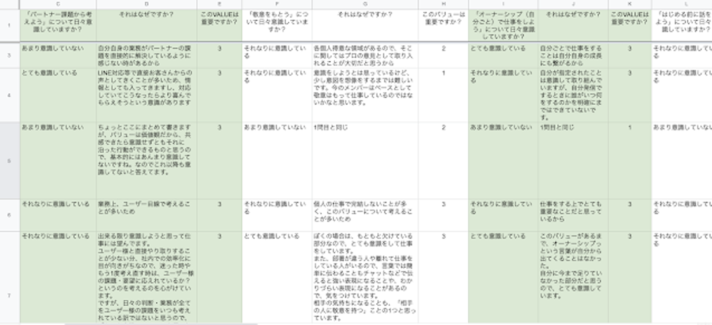 そこでバリューの叩き台を考える前に、社内でバリューのアンケートを取り、現在のバリューで僕が見落としている課題がないか、混乱がないかを確認した。
