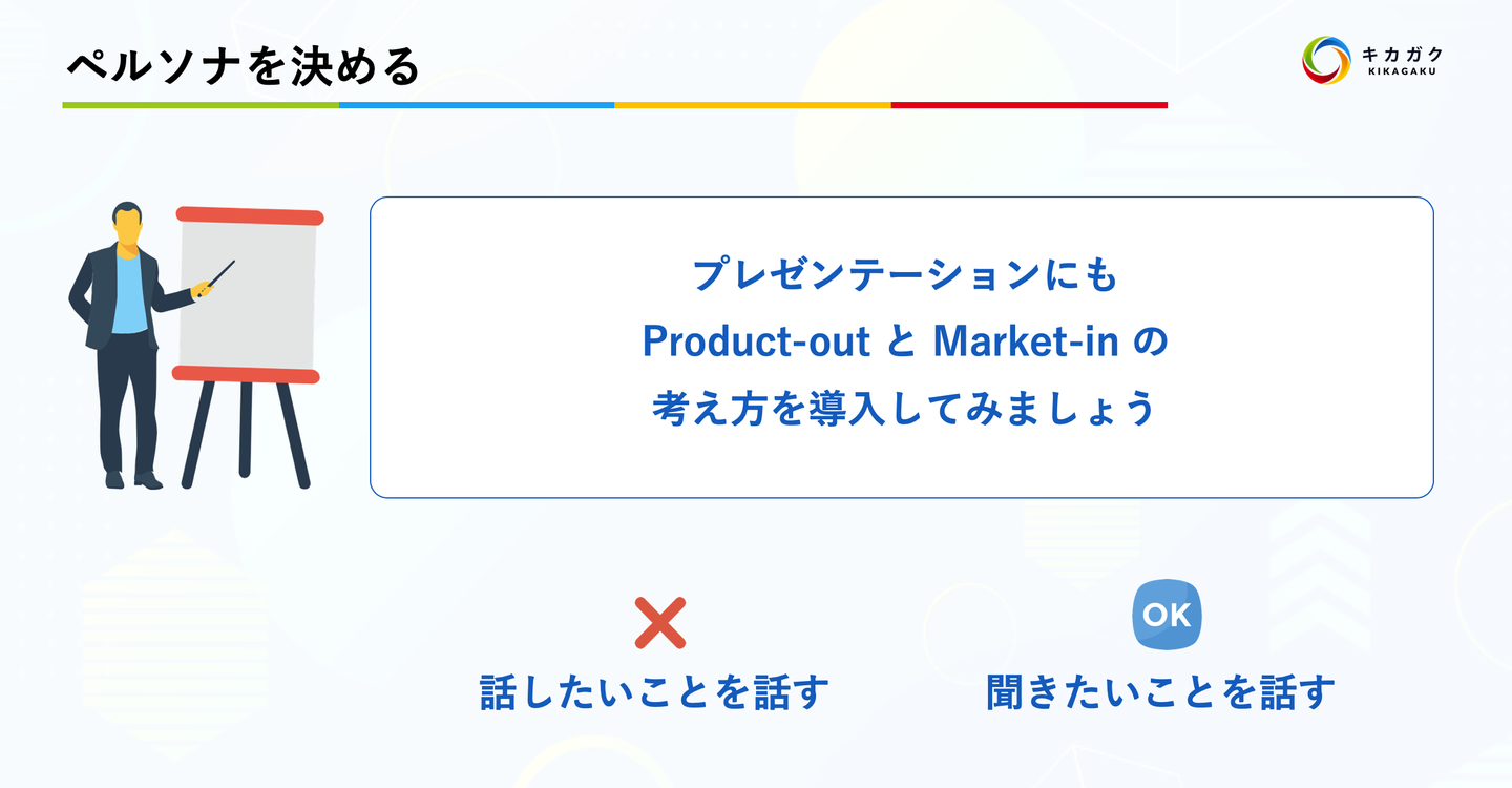 このペルソナを決めておかないと、プレゼンテーション側が話したいことを話すことになってしまい、そういったプレゼンテーションによく遭遇します。