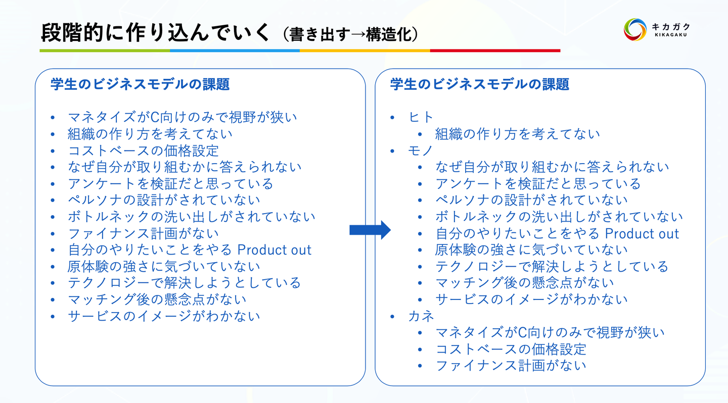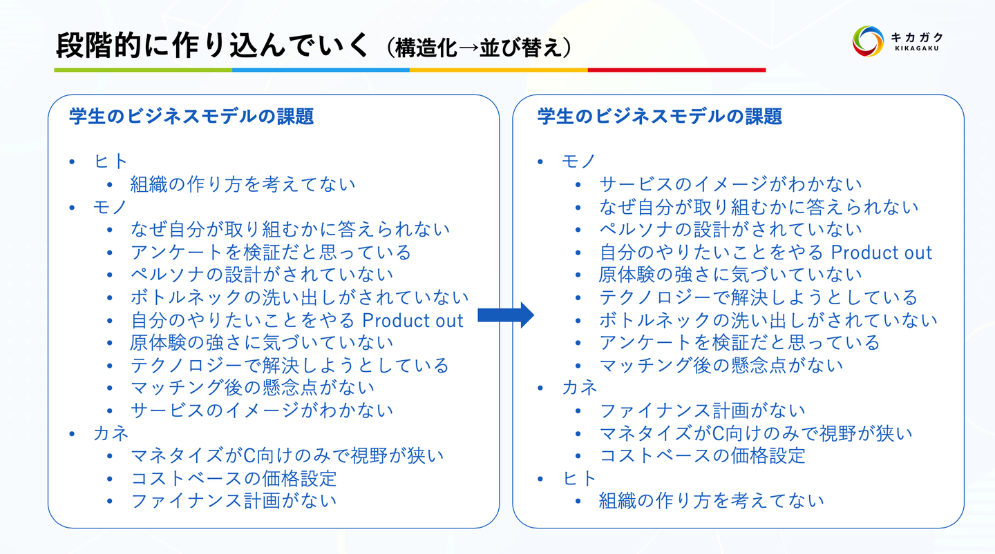 これは具体例を見るほうがわかりやすいため、学生のビジネスモデルの課題というテーマでプレゼンテーションの内容を考えていくときの事例を見ていきます。