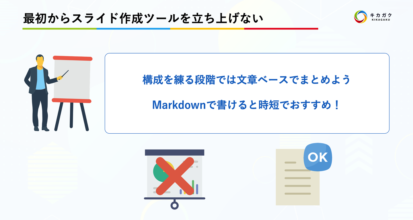 そこで、キカガクのメンバーには教えているプレゼンテーション資料作成の方法を今回はお伝えしようと決めました。