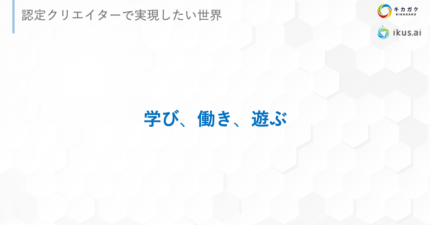 そのときに、オンライン環境でも関係なく成長した認定クリエイターが社会のあらゆる場所で活躍しているという未来を作りたいです。