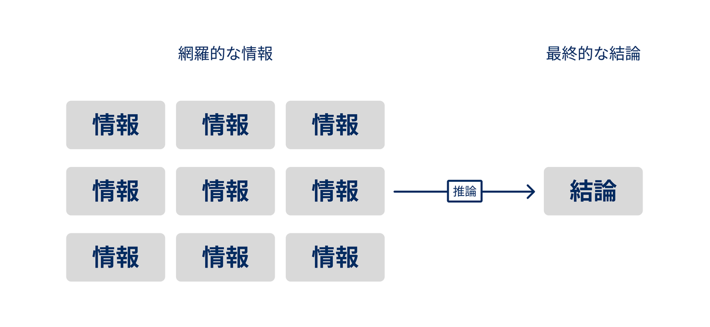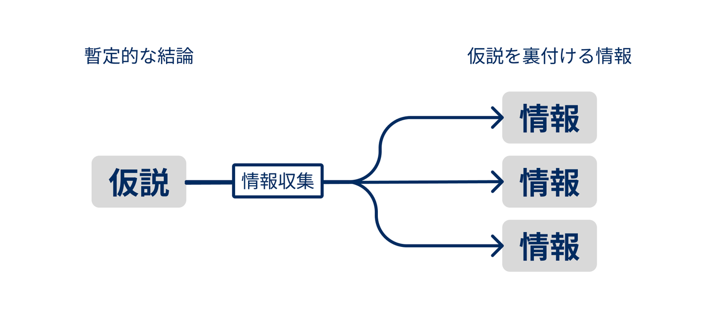 仮説思考というのは、平たくいうと先に結論、つまり仮説を決め打ちして、その根拠となるような情報をピンポイントに探していくという考え方です。それでもし結論が反駁されたら別の仮説を探る、という形で、効率的に情報を集める目的で使われるものです。