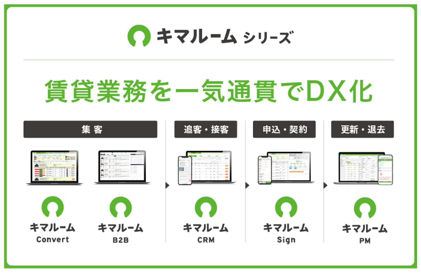 西野)「入居者募集」と「電子申込・契約」のサービスをリリースして、その間を埋める「追客対応」のサービス「キマルーム CRM」、更新・退去のシステム「キマルーム PM」を順次リリースし、一気通貫で賃貸業界の課題解決ができる「キマルーム」シリーズに成長しました。