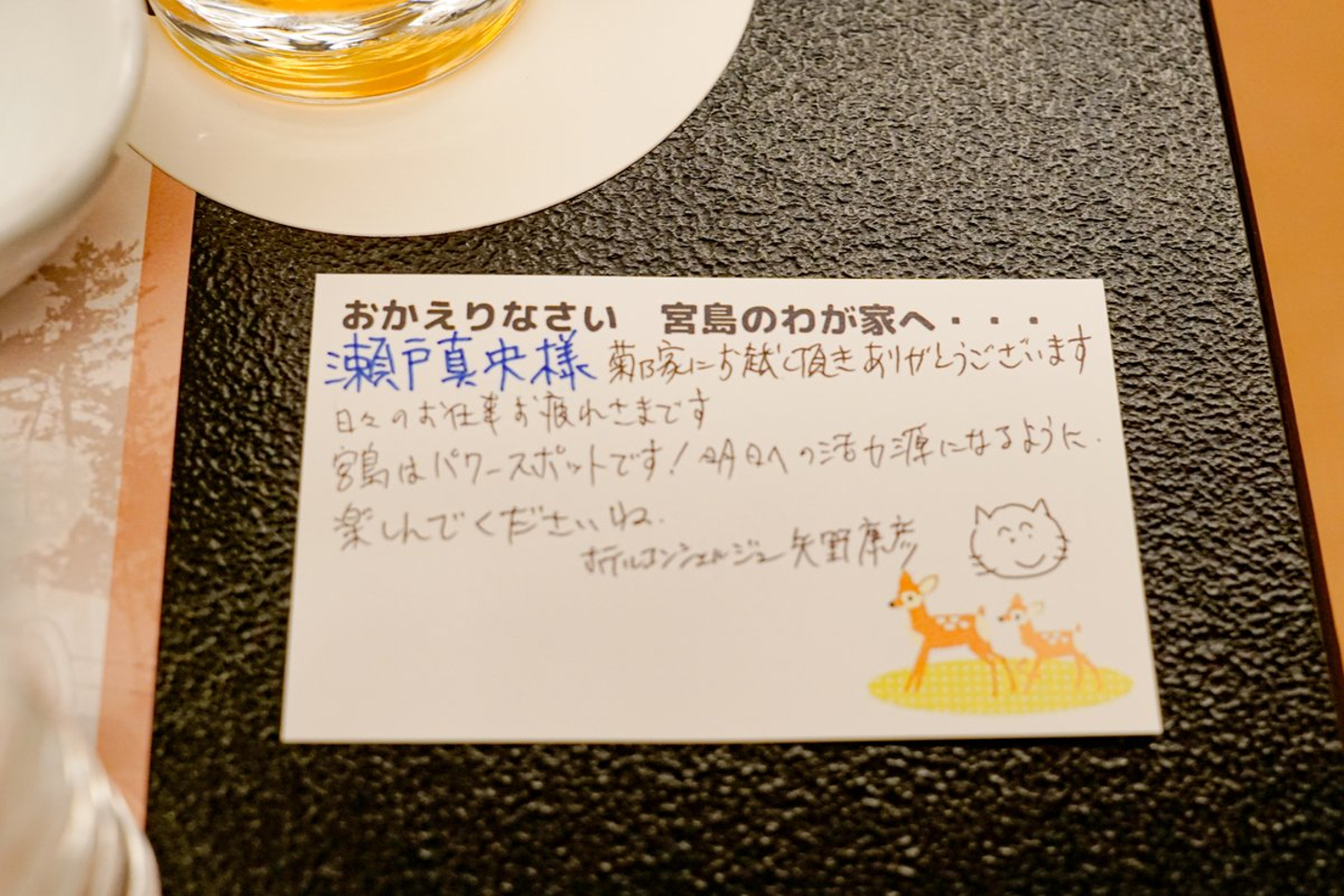 夕食の席にはコンシェルジュの方からひとりひとりにメッセージカードが添えられていて感動〜〜。