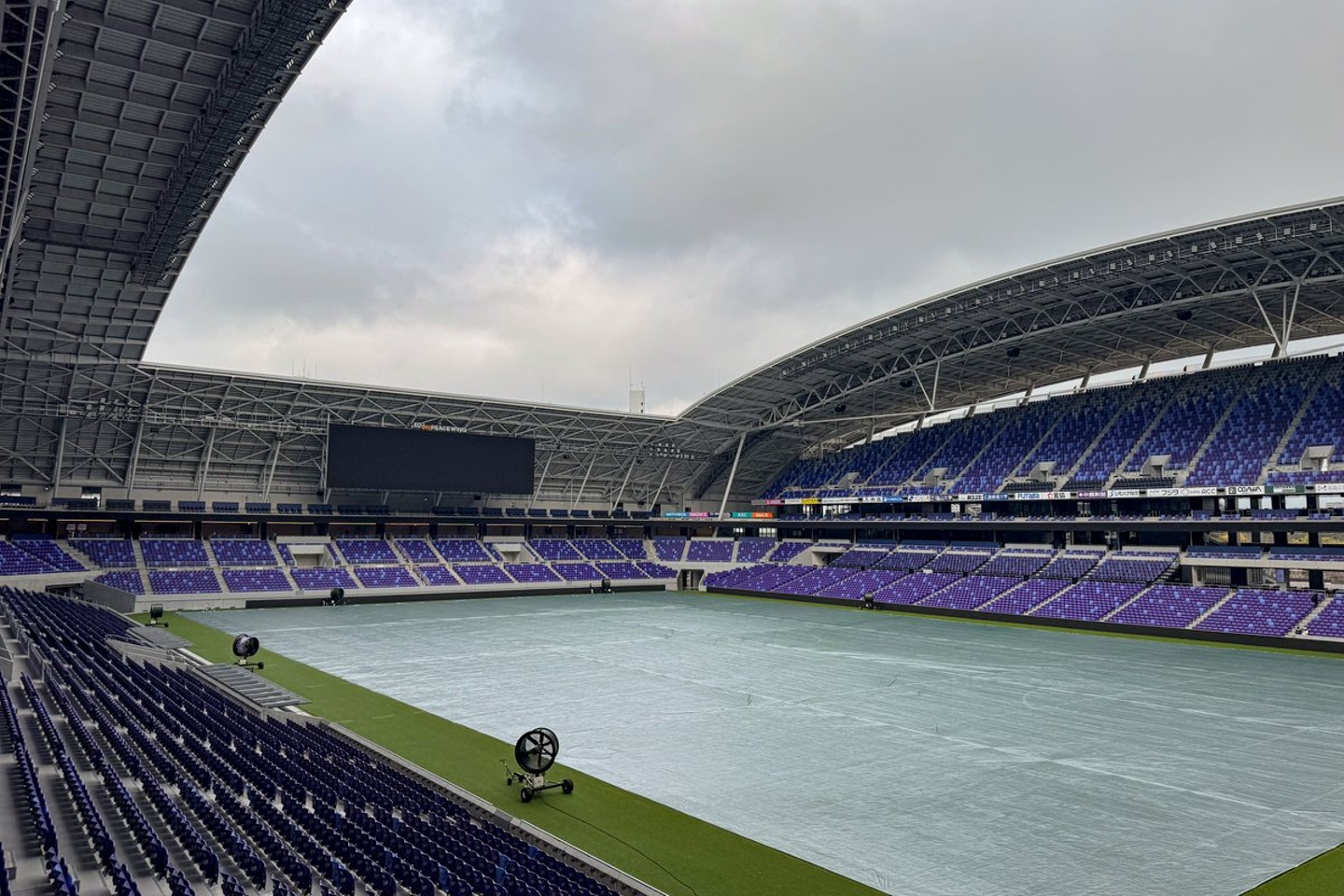 ピッチは遮光シートで日差しを避け、巨大な扇風機で送風し続けることで健康な芝生に育つのだそうです。