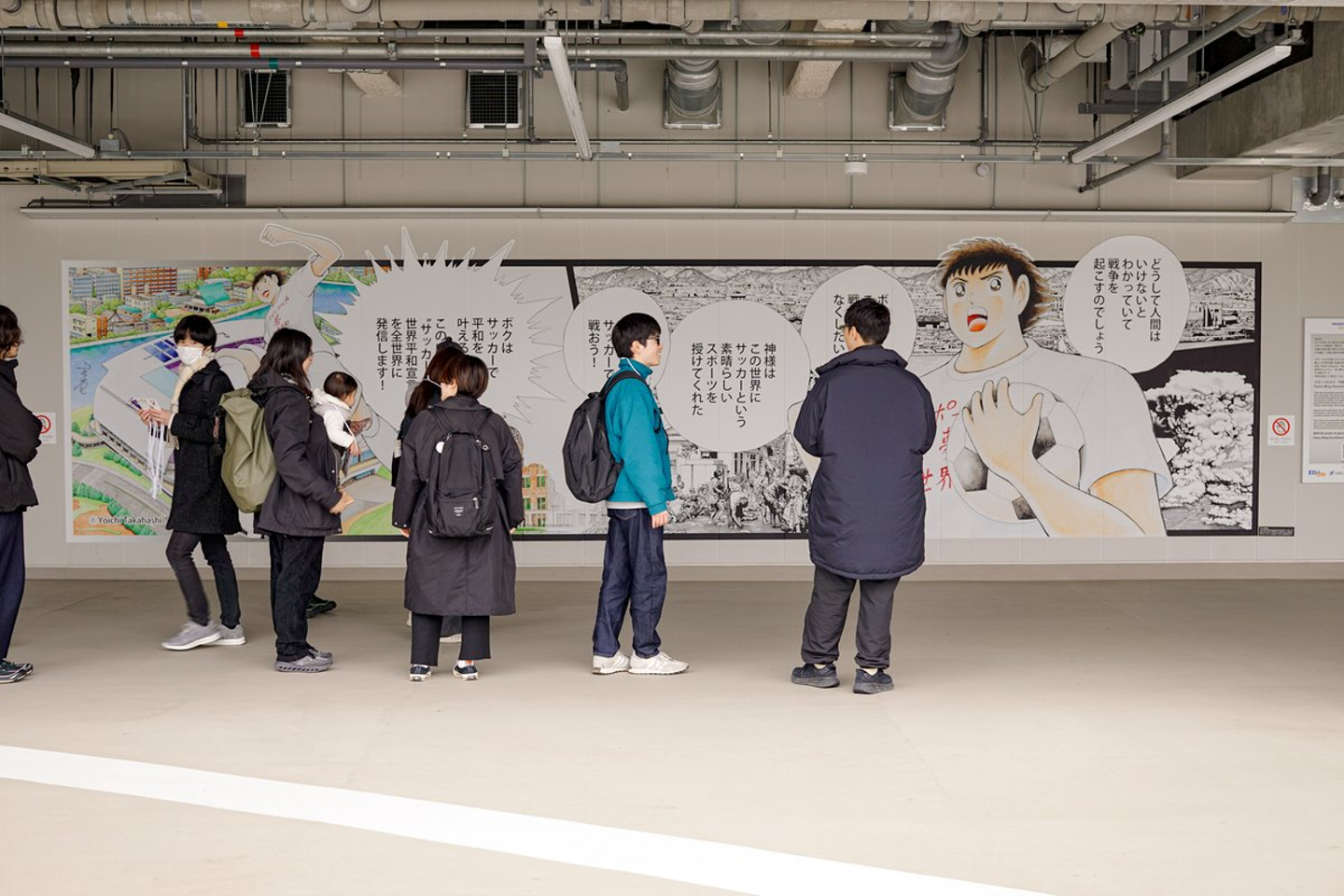 この壁画は「スポーツの力」「夢」「世界平和」という3つのテーマを世界に発信していく「エディオンピースウイング広島」と『キャプテン翼』のコラボプロジェクト「PEACE WING HIROSHIMA PROJECT ONE」の象徴です。